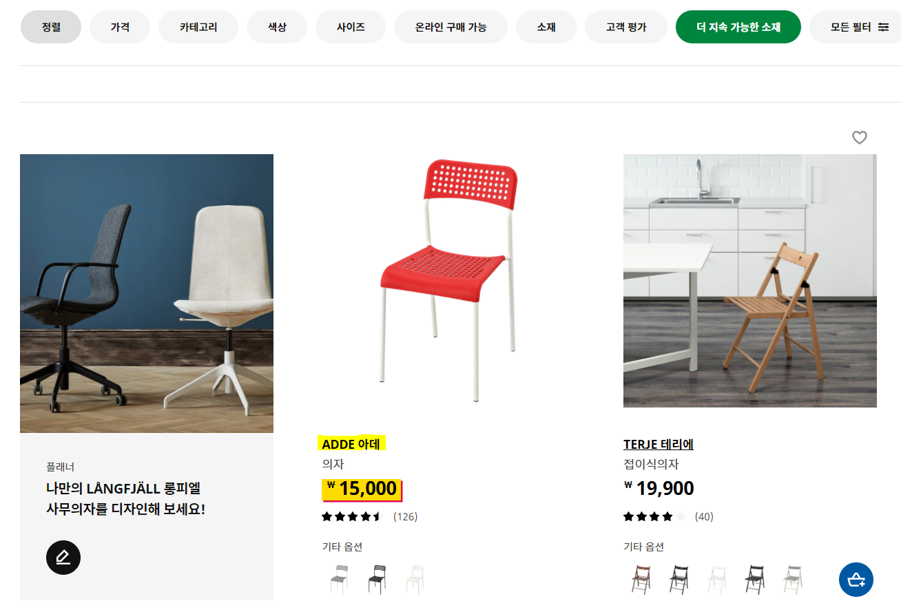 의자 1개당 가격은 15,000원으로 치킨보다 저렴한 가격입니다.