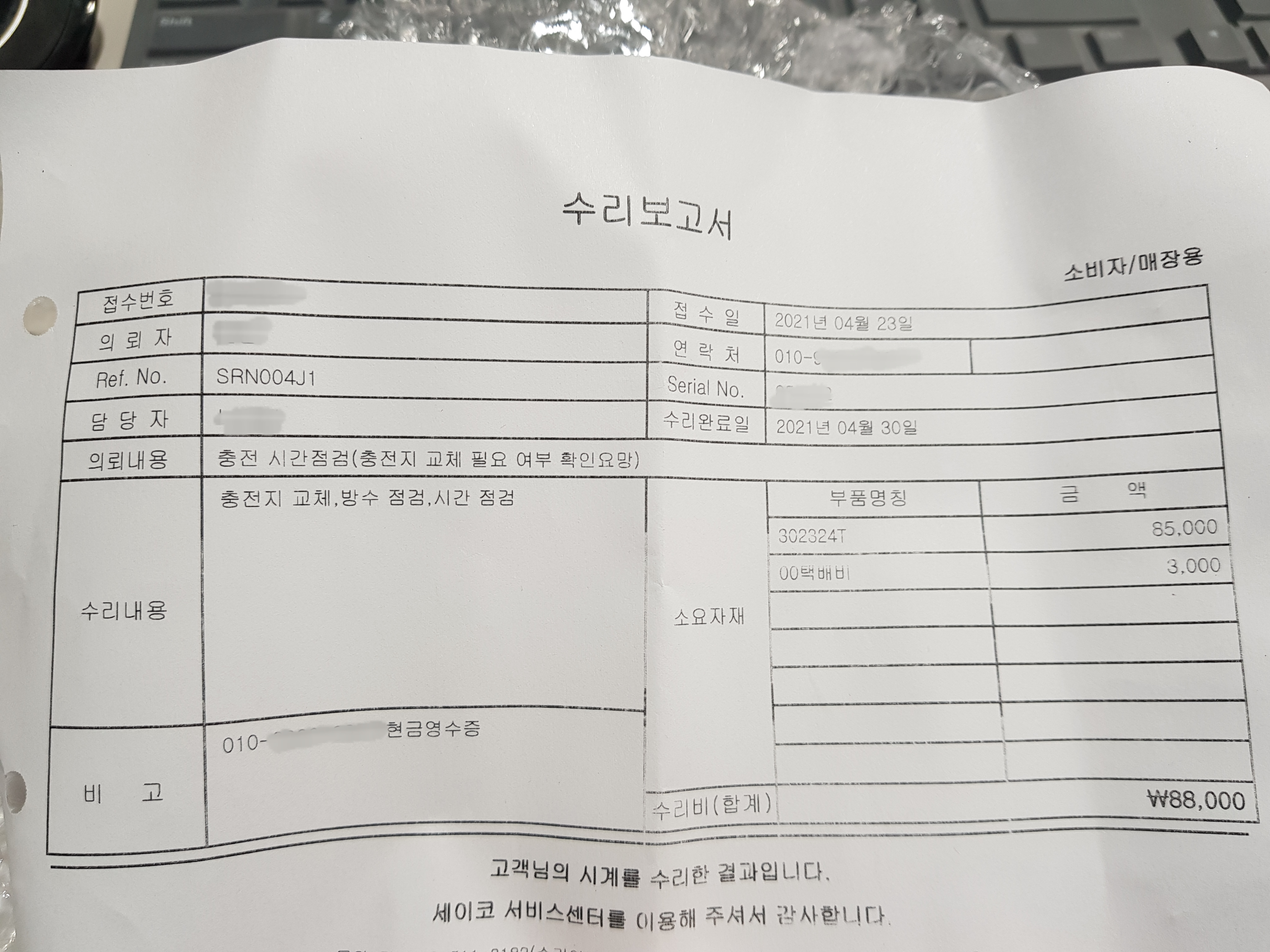 처음 시계를 맡기면서 엔지니어분이 수리 직전에 전화 줄거라 했는데