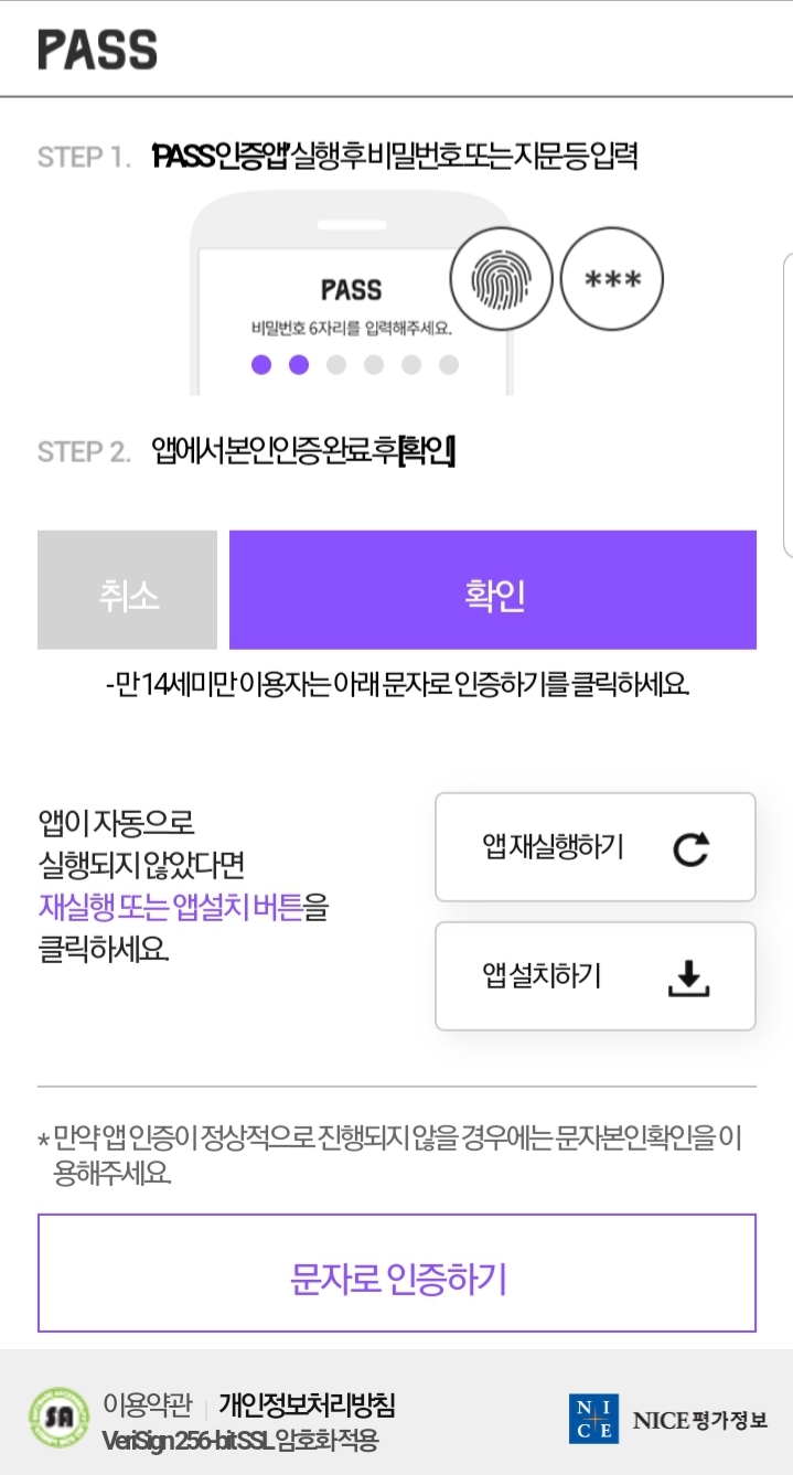 이 화면에서 보라색 테두리로 되어 있는 '문자로 인증하기' 버튼을 눌러주시면 됩니다.