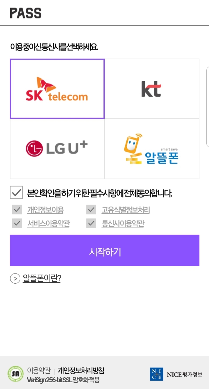 일단은 아무런 통신사를 선택한 뒤 전체동의를 하고 시작하기를 눌러줍니다.