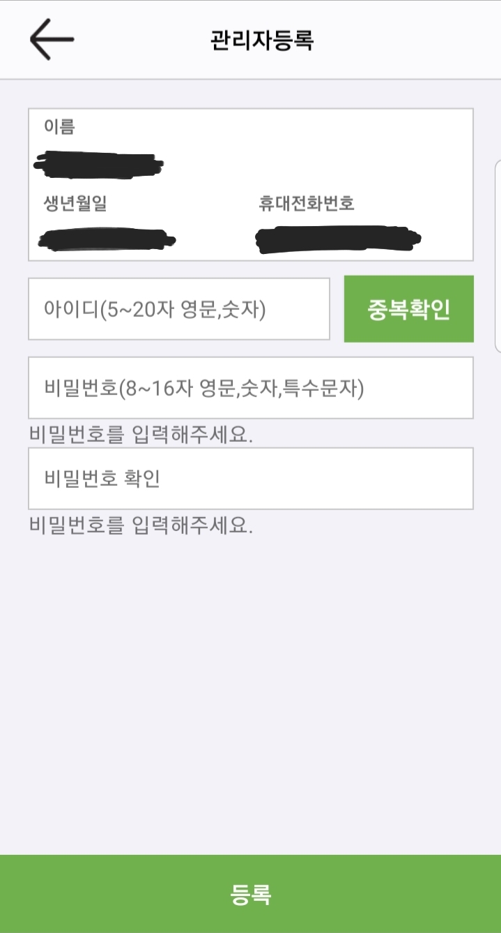 그러면 관리자등록 화면에서 개인 인증을 했던 분의 이름, 생년월일과 휴대전화번호가 입력이 됩니다.