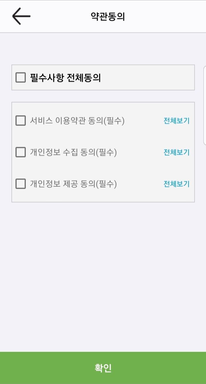 걱정 마시고 '필수사항 전체동의'를 누른 뒤 아래의 초록색 확인을 눌러줍니다.