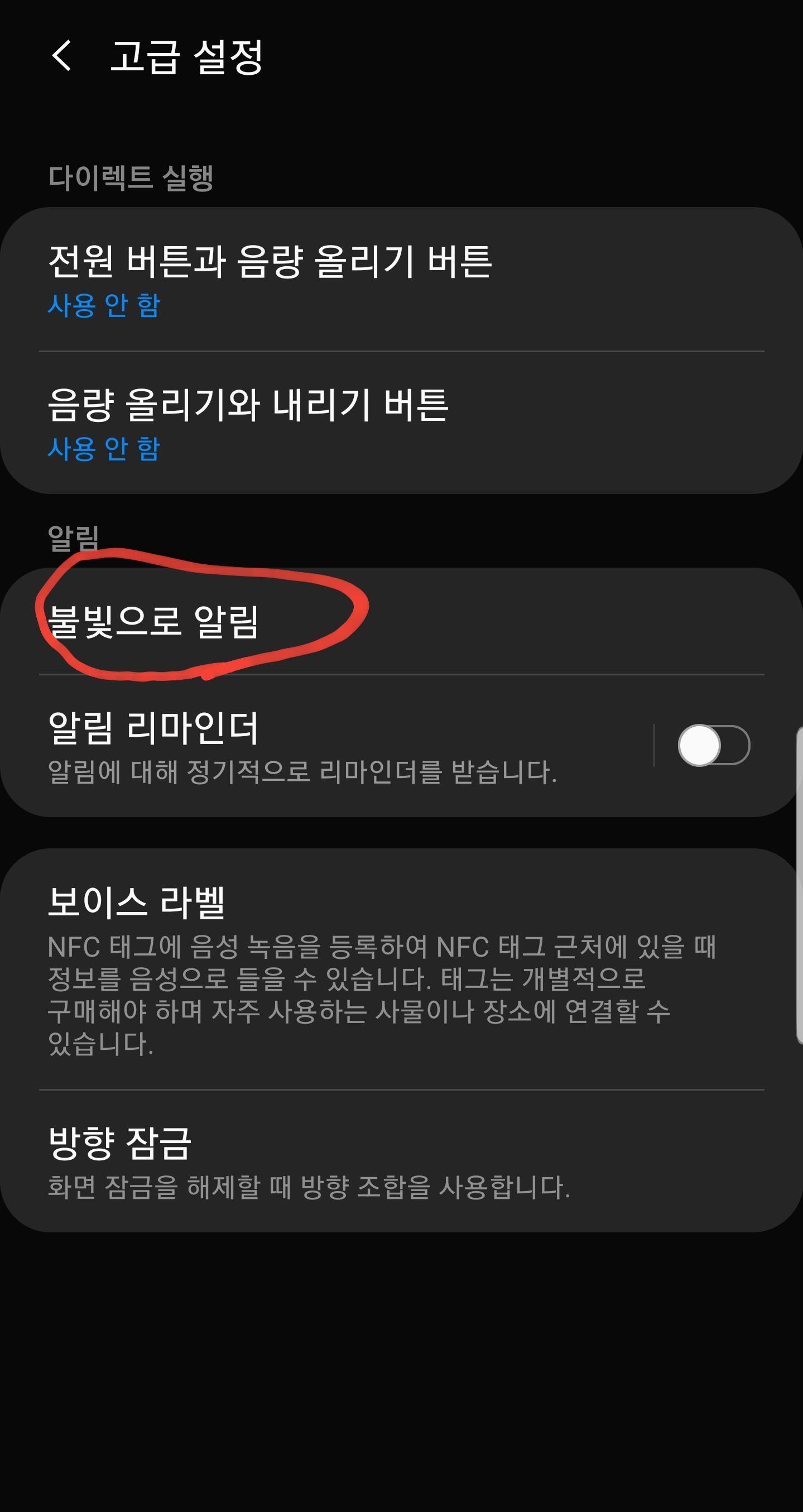 고급 설정에 들어가면 '알림'이라는 곳에 가면 우리가 그토록 찾아 헤맸던 '불빛으로 알림'이라는 것이 있습니다.