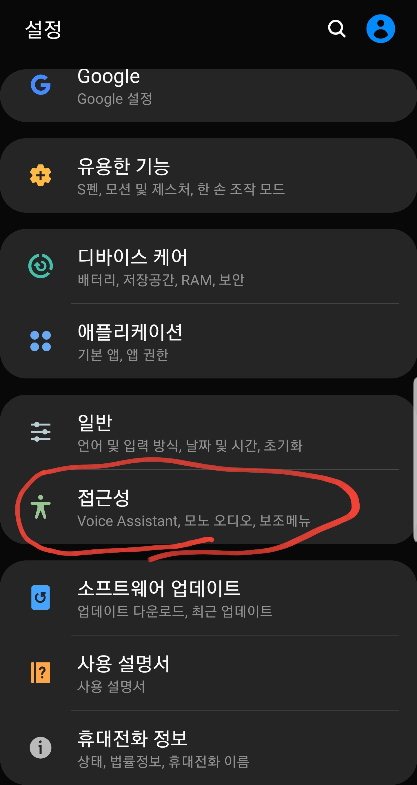 그래서 스마트폰 제조사에서는 다양한 지원 기능을 넣어놨는데 이것이 바로 '접근성'이라는 항목입니다.