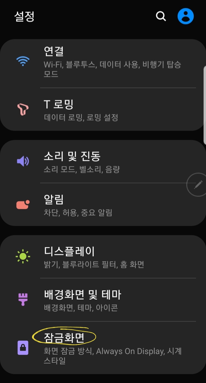 화면을 아래로 조금 내리다보면 '잠금화면'이라는 것이 나옵니다.