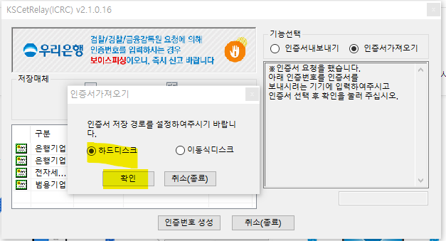 혹시나 인증서를 발급 받아야 하시는 분들은 최초에 은행에 내방하셔야 합니다. (인터넷 뱅킹 미동의시)