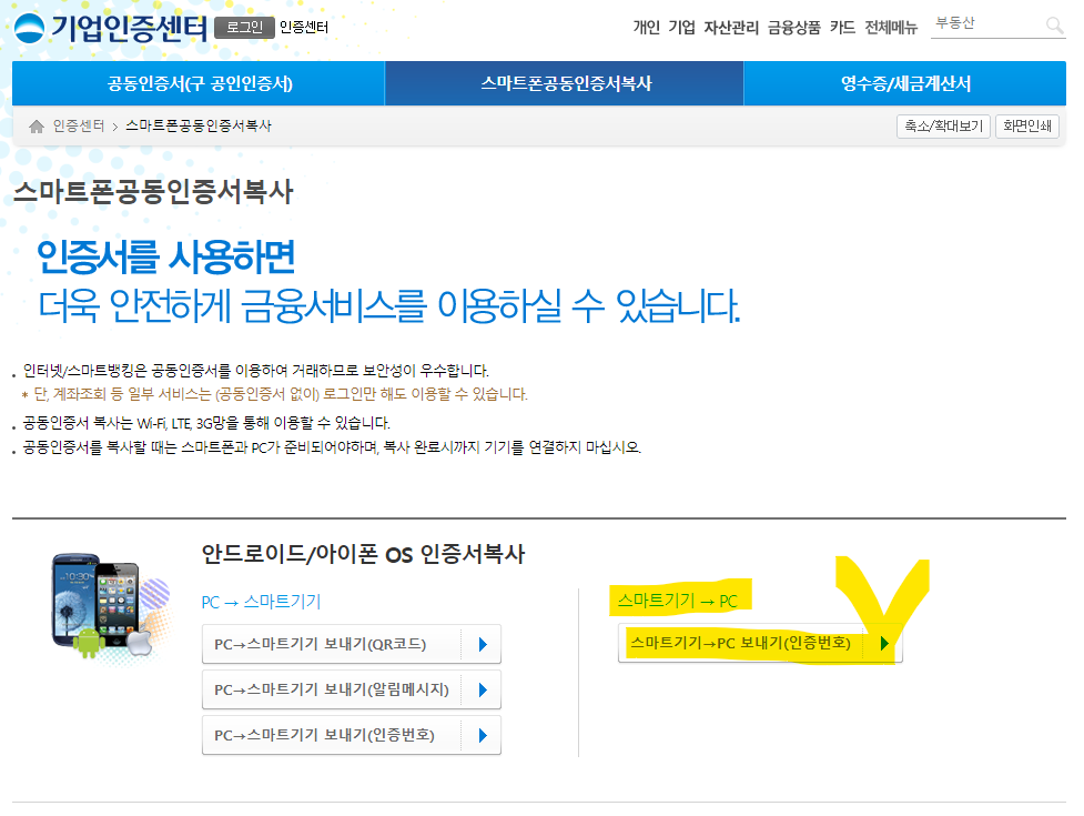 노란색으로 표시해둔 '스마트폰인증서복사'에 있는 '바로가기'를 눌러야 합니다.