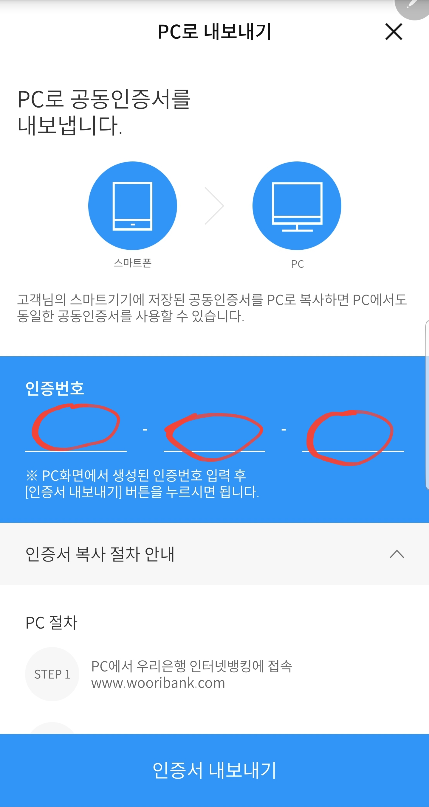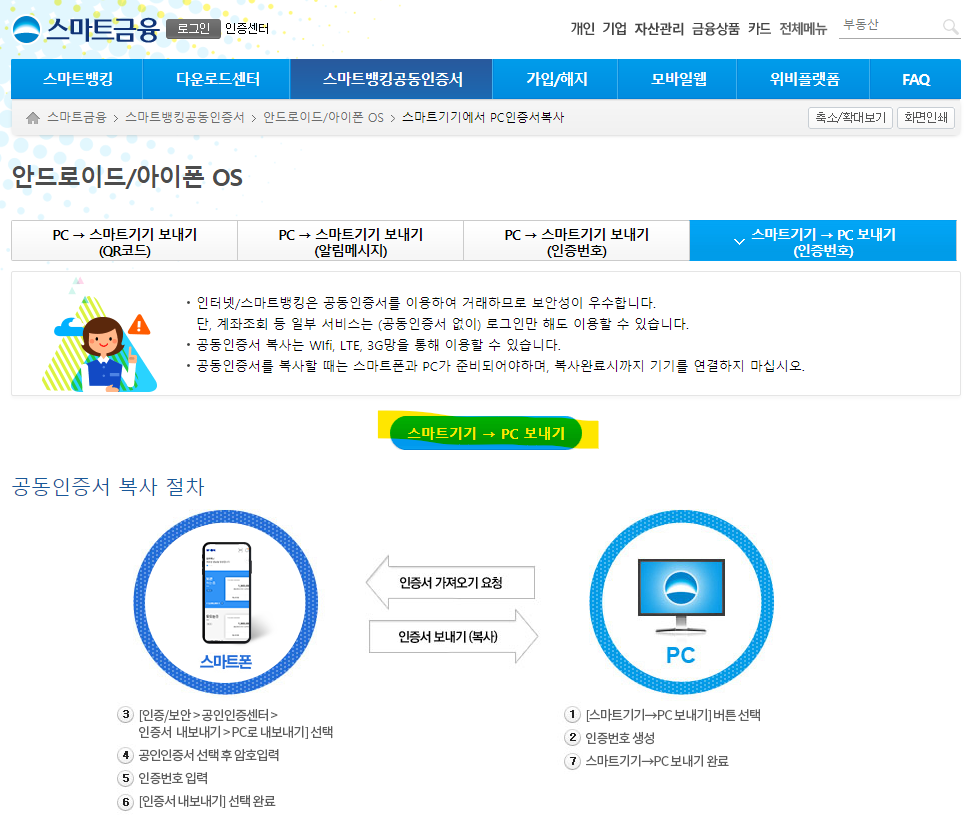 지금 알려드릴 내용은 스마트폰에 저장된 인증서를 PC에 복사하는 방법입니다.