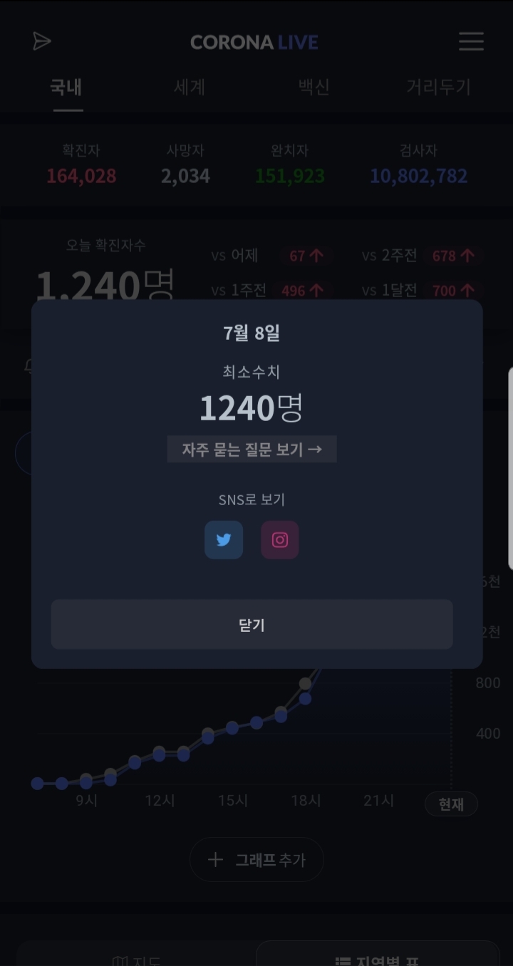 제가 아래 화면을 캡처할 때가 8일이었는데 6, 7일은 이미 1일 확진자가 1,000명을 넘은 상황이었고