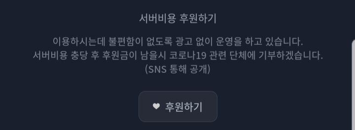 이런 웹사이트를 운영하는 것은 서버 유지 비용이 드는데 착하게도 유지 비용이 남으면 코로나 관련 단체에 기부를 한다고 하니 많은 참여 바랍니다.