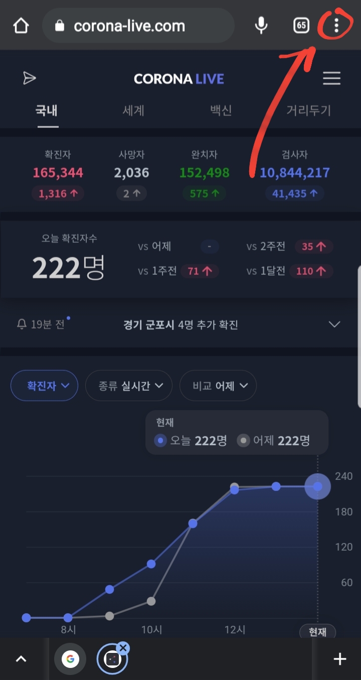 폰에서 코로나 라이브 사이트로 들어간 뒤 화면 우측에 있는 설정 버튼을 눌러줍니다.