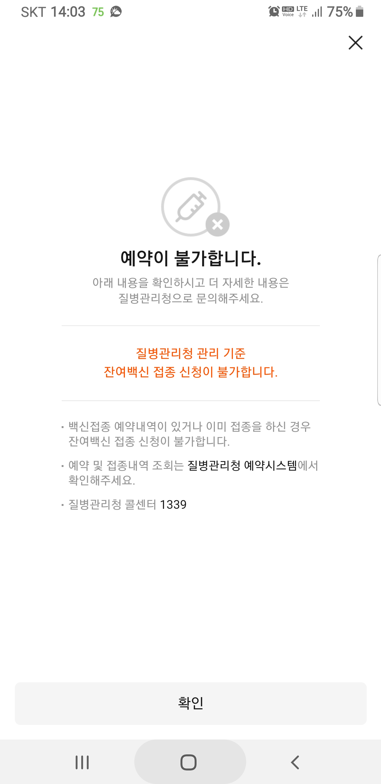그래서 질병관리청 예약시스템에 들어가서 취소를 한 뒤 다시 해봐도 동일한 증상이었습니다. 결국 1339에 전화를 해서 사정을 설명하니 아직 전산으로 처리가 안되니, 그냥 병원에 직접 전화를 해서 예약하고 바로 가서 맞으면 된다는 걸 확인할 수 있었습니다. 그러니 얀센 1차 맞으신 분들 사전예약하셔도 그냥 바로 잔여백신 맞으실 수 있어요. (다만 병원측 이야기를 보니, 직접 취소를 해주면 일이 적다고 하네요.)