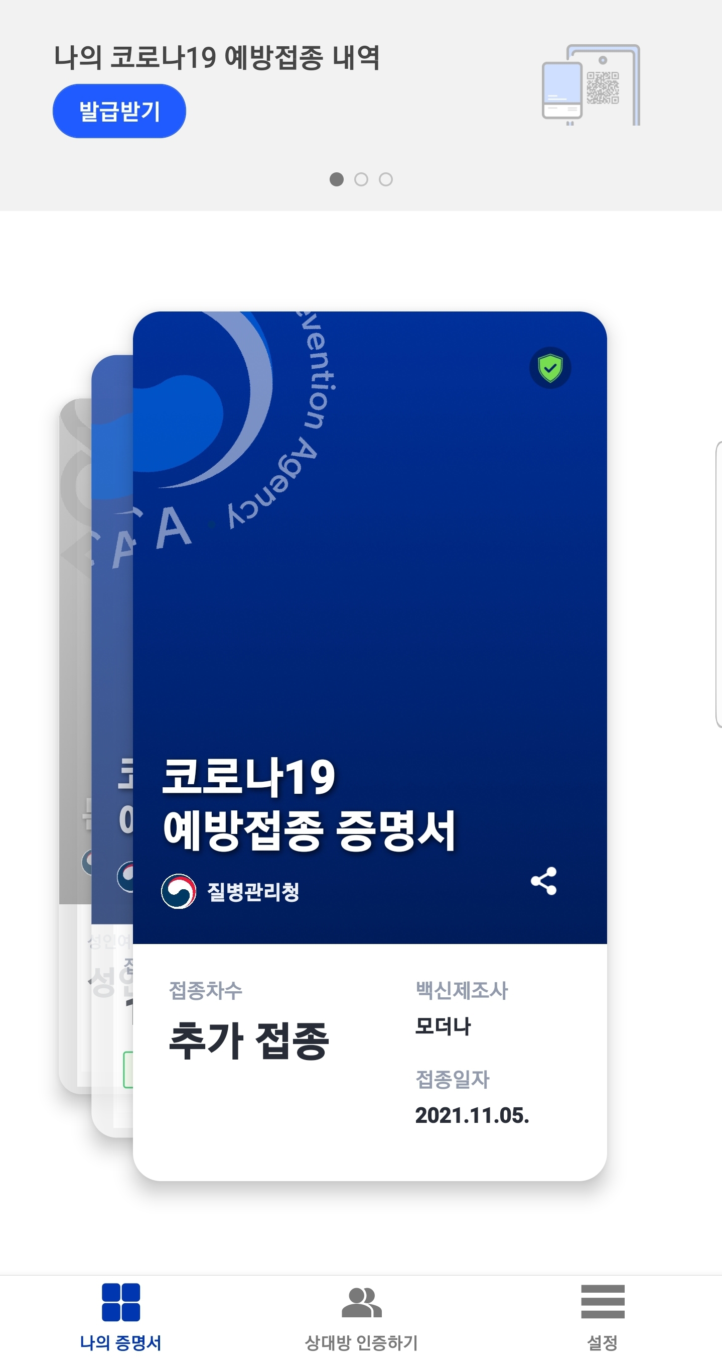 접종 후에는 아무도 상관 안하지만 나름 훈장처럼 생각하는 예방접종 증명서를 바로 확인할 수 있었습니다. 아래와 같이 접종차수에는 '추가 접종'이 뜨고 백신 종류도 뜨네요.