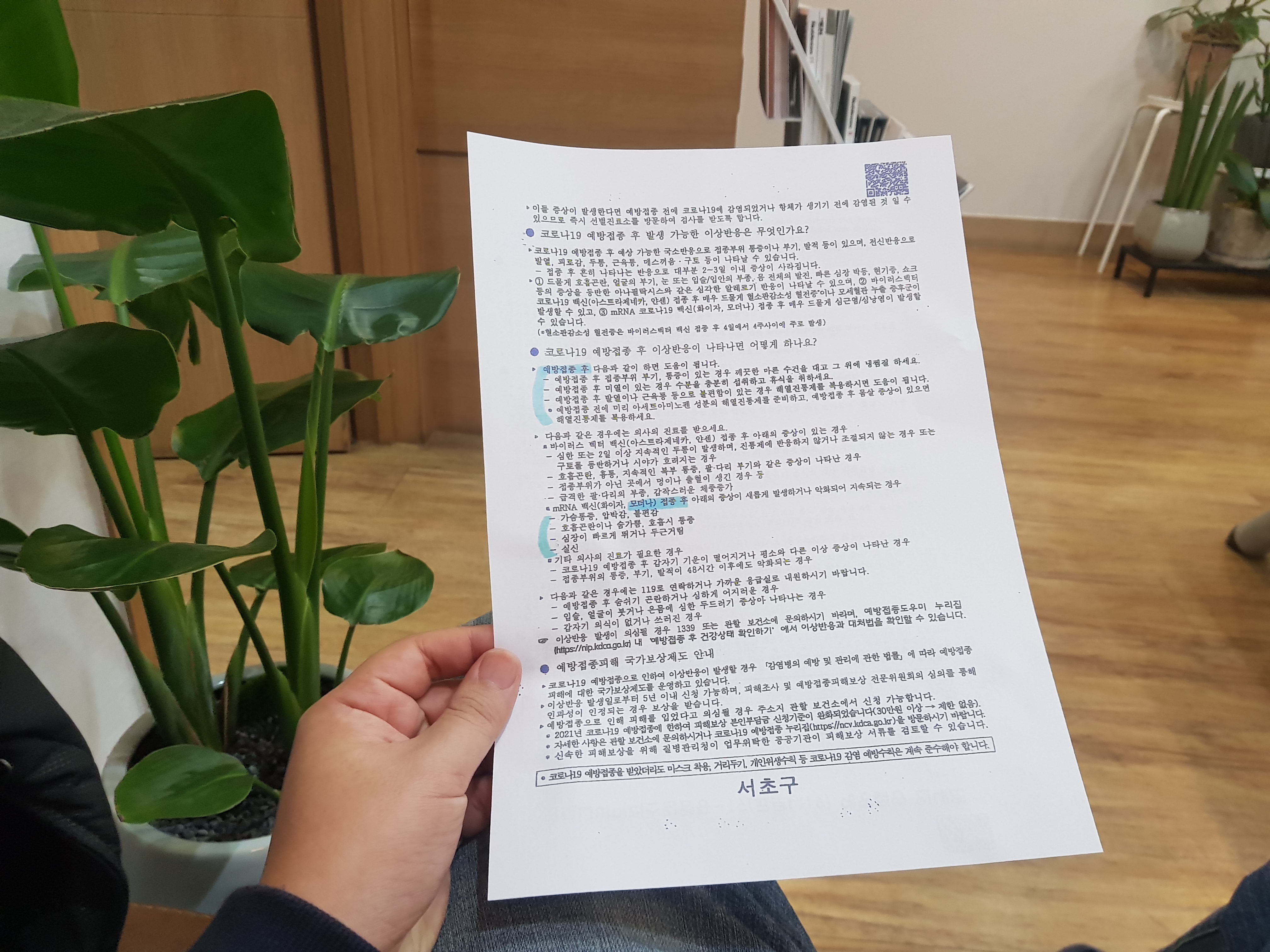 1차 때와는 다르게 의사선생님이 직접 꼼꼼하게 진찰을 하고, 직접 백신을 주사해주더군요. 그리고 15분 정도 앉아 있다가 가라면서 읽을 거리를 주는데 추가접종에 대한 이야기는 따로 없었습니다. 아무래도 추가접종 대상자 중 아주 빠르게 맞다보니 어쩔 수 없는게 아닌가 싶네요.
