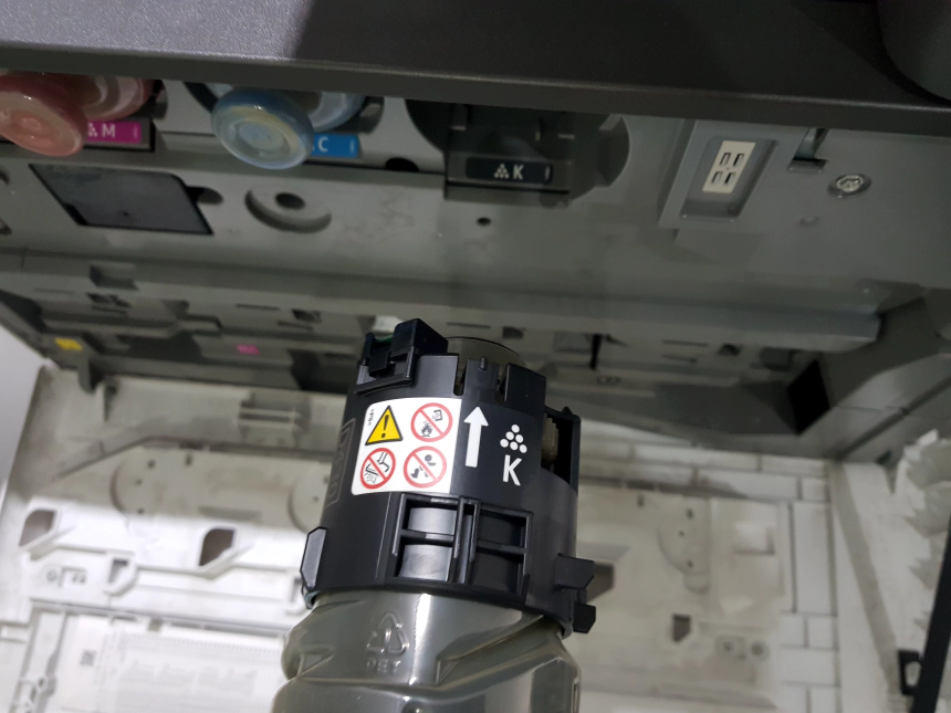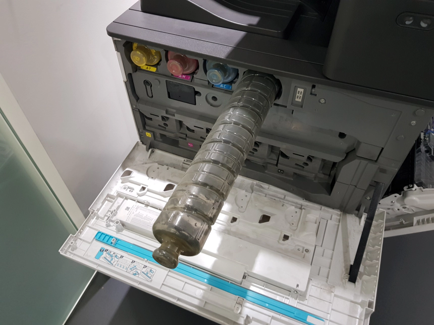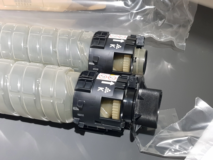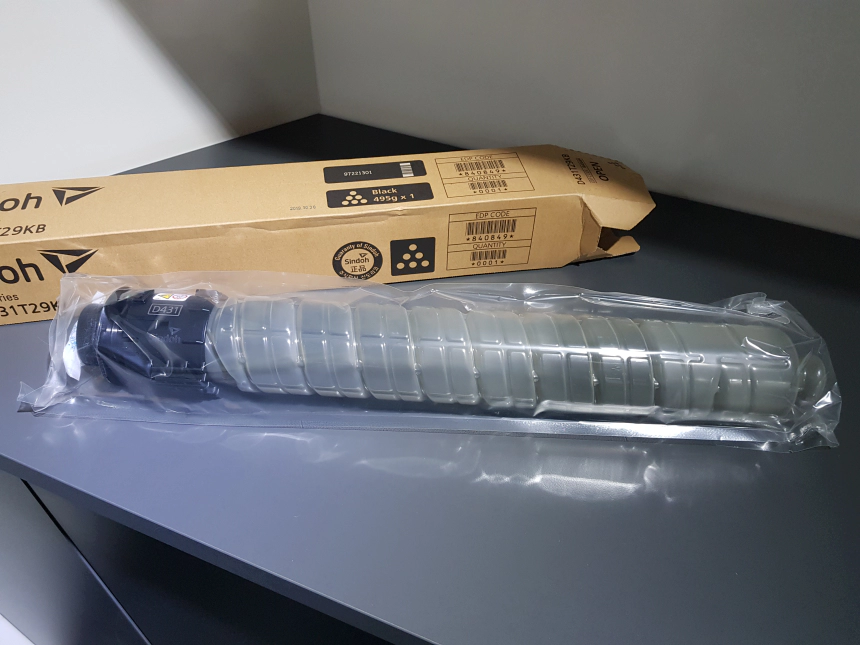 기사님과 통화를 해보니 복합기 최하단에 신품 코너를 미리 하나 넣어두셨다고 하더군요. 그래서 꺼내봅니다. 그동안 소형 복합기만 다루다가 이렇게 커다란 복합기의 토너는 처음 보는 것 같은데 상당히 큽니다. 그렇다고 전혀 무겁지는 않구요.