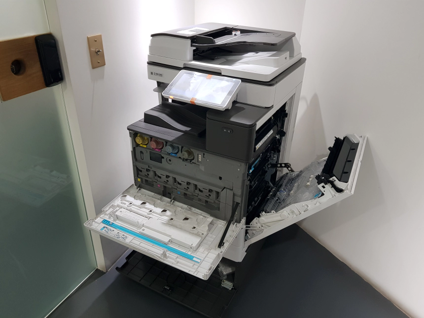 자, 이제 토너를 준비했으니 다시 복합기를 바라봅시다. 사실 토너를 넣는 곳은 기기의 옆면이 아닌 정면에 있습니다. 모니터 바로 아래에 있어 양쪽 홈을 잡고 잡아 당기면 아래와 같이 쉽게 열립니다.