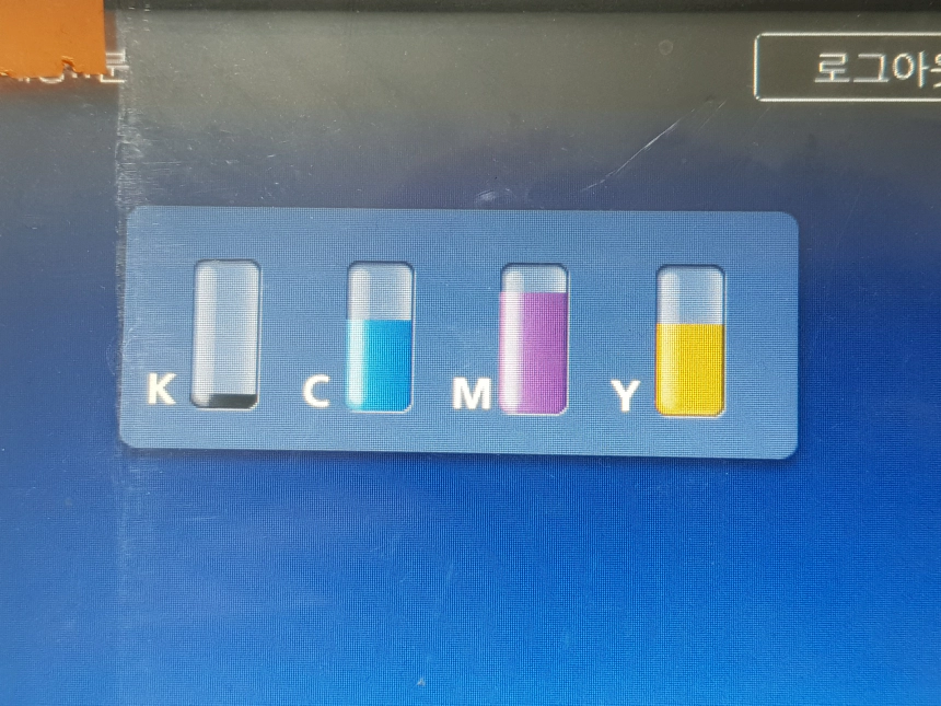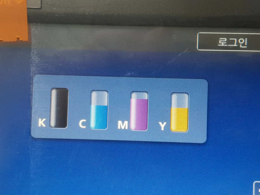 우선 교체 전 머니터 화면에 보니 다른 색상들은 괜찮은데 까만색 토너가 부족하다는 것이 확인이 됩니다. 경고등이 막 점등된 정도라 더 사용할 수 있을 것 같기는 한데 여러 장 한 번에 출력하다가 인쇄가 안되면 좀 짜증나니 교체해줍시다.