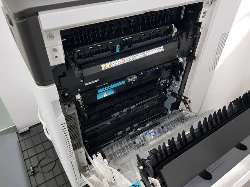 이제 복합기 어느 곳에 토너를 넣는지 확인해볼 차례 입니다. 저는 약간 습관(?)처럼 복합기 옆면을 먼저 열어 봤는데 저 곳은 아닙니다. 저 곳은 용지가 걸렸을 때 끼여 있는 문서를 꺼내는 곳이지 토너와는 상관이 없습니다.