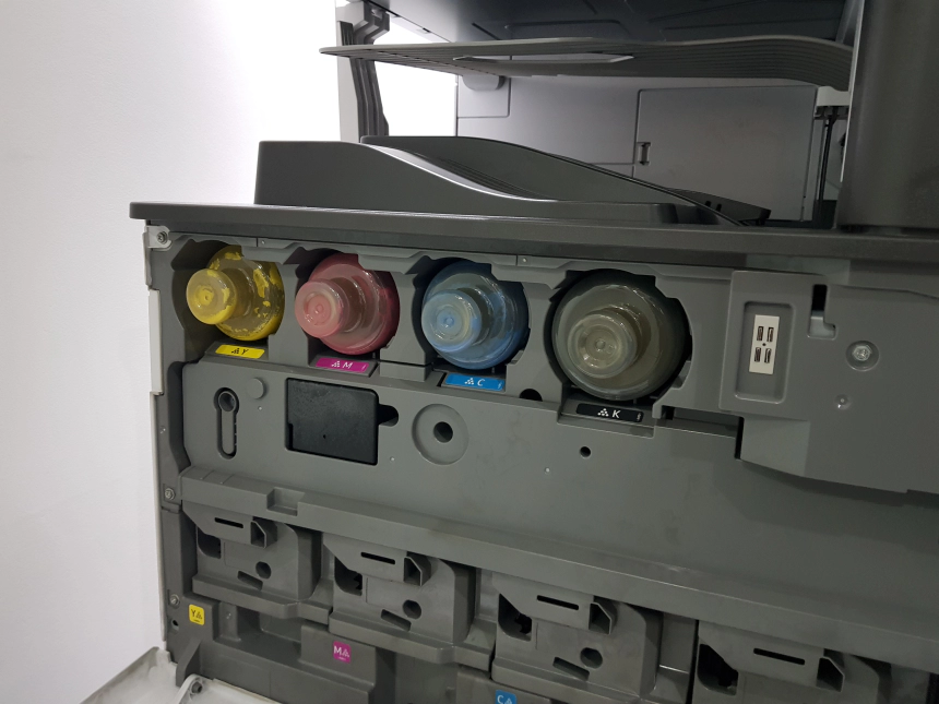 노란색, 빨간색, 파란색 그리고 까만색 토너가 보이죠? 우리는 이번에 까만색 토너를 교체해 보도록 하겠습니다. 그리고 자세히 보시면 확실히 사용량이 많은 까만색 토너가 가장 굵다는 것이 특징입니다.