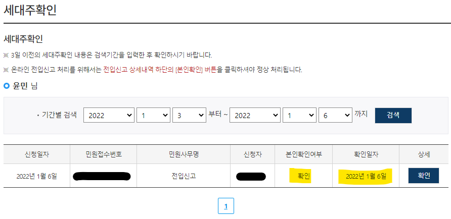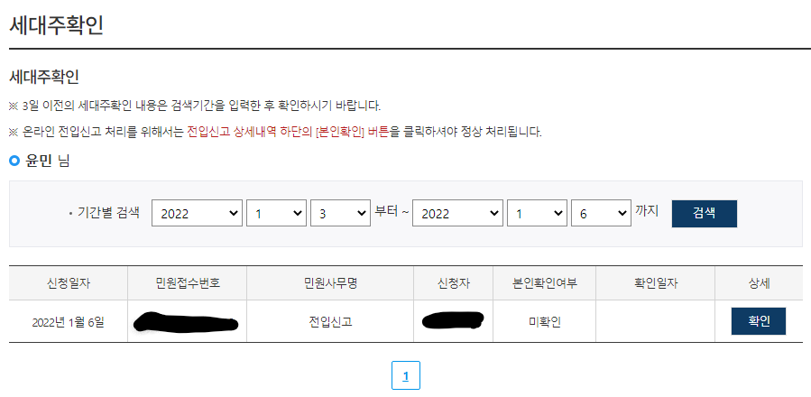 6. 이제 세대원이 신청한 정보를 찾을 때 입니다.
