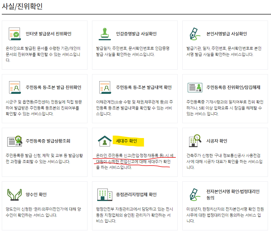 3. '사실/진위확인'을 누르면 다시 아래와 같이 여러 항목들이 나오는데 '세대주 확인'을 눌러줍니다.