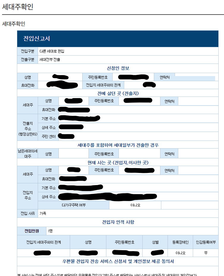 상세 내역을 누르면 아래와 같이 세대원이 누구이고 어디서 어디로 전입신고를 하게 되었는지 확인할 수 있습니다. 뭐 대단한 정보는 없으니 한 번 쭉 읽어보면서 아래로 내려줍니다.