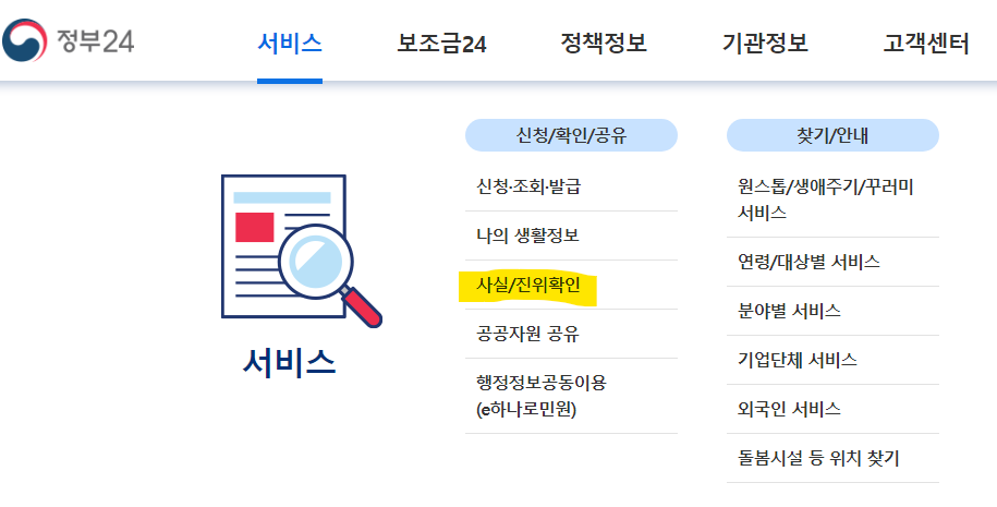 2. 사이트에 들어가서 상단 메뉴들 중 '서비스' → '신청/확인/공유' → '사실/진위확인' 을 눌러줍니다.