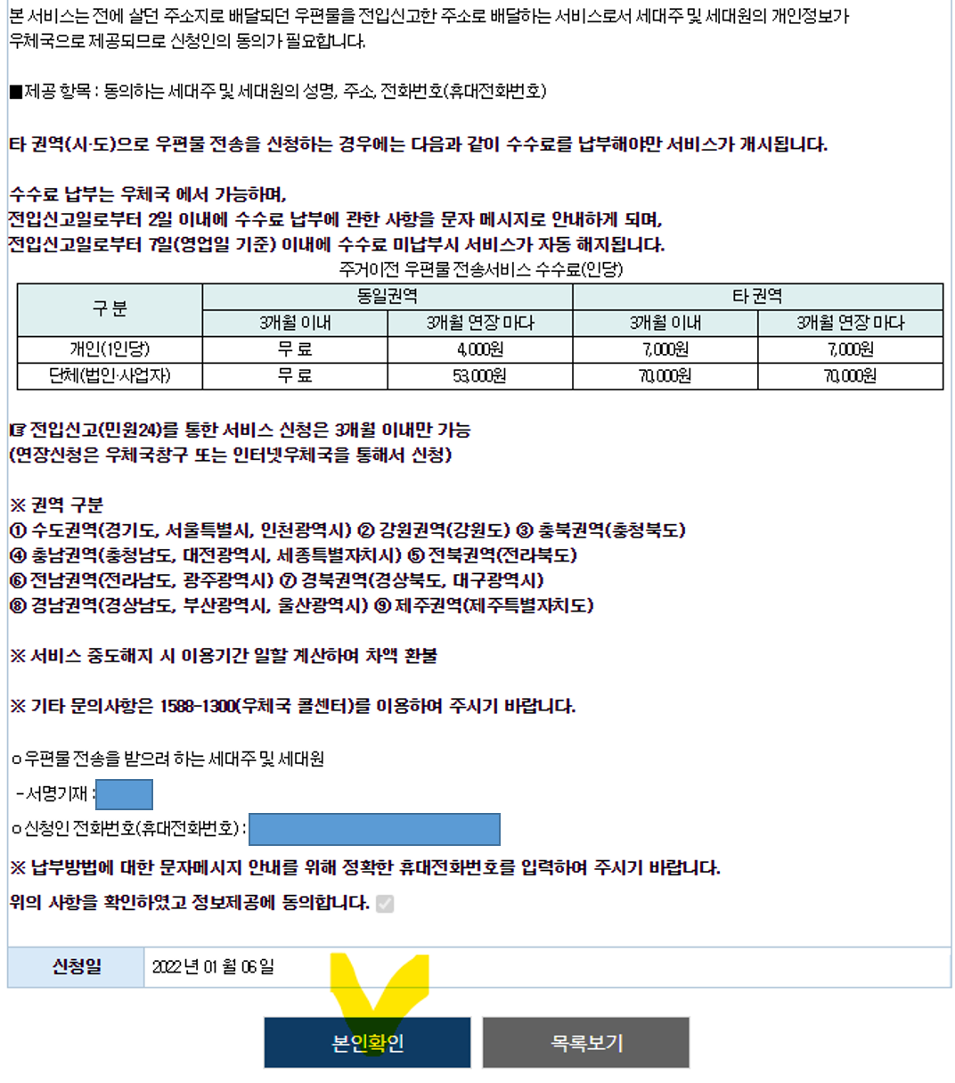 주의하실 점은 아래사진에 짙은 파란색으로 박스가 있는 곳에 정보가 확실한지 점검해줘야 합니다. 그리고 이상이 없다면 노란색으로 표시한 '본인확인' 버튼을 눌러줍니다.