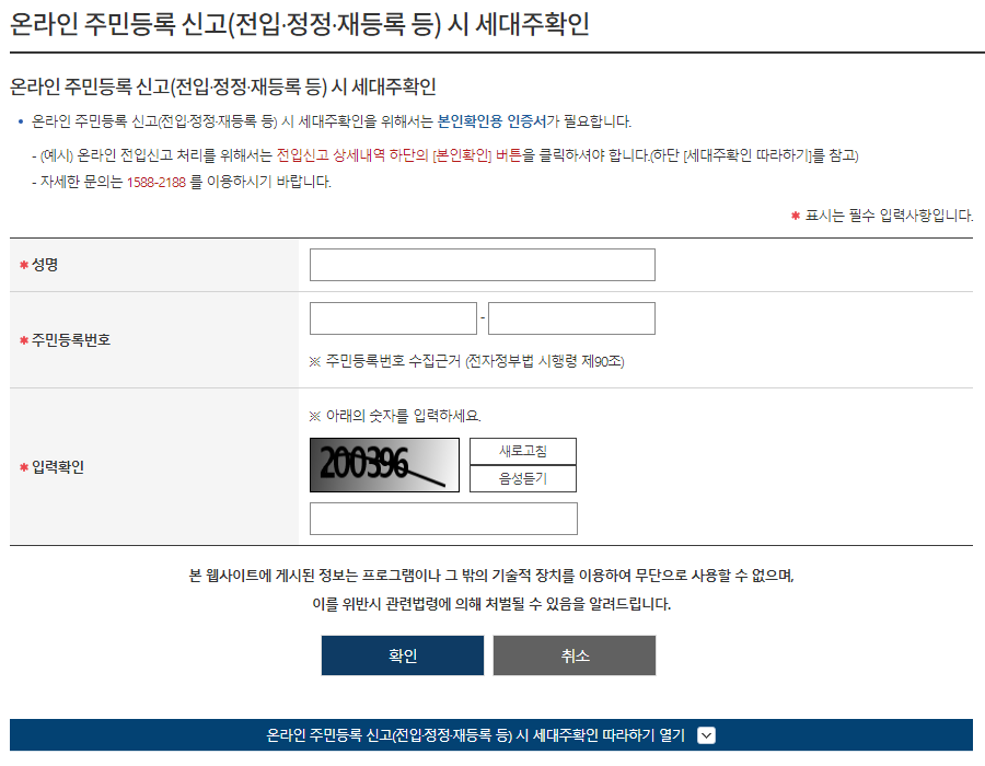 온라인 주민등록 전입 세대원 세대주 확인 방법