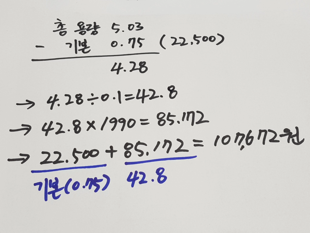 기본요금 22500원(0.75)과 잔여 용량요금인 85172원(4.28)을 더하면 총 금액이 107672원이 나오네요.
