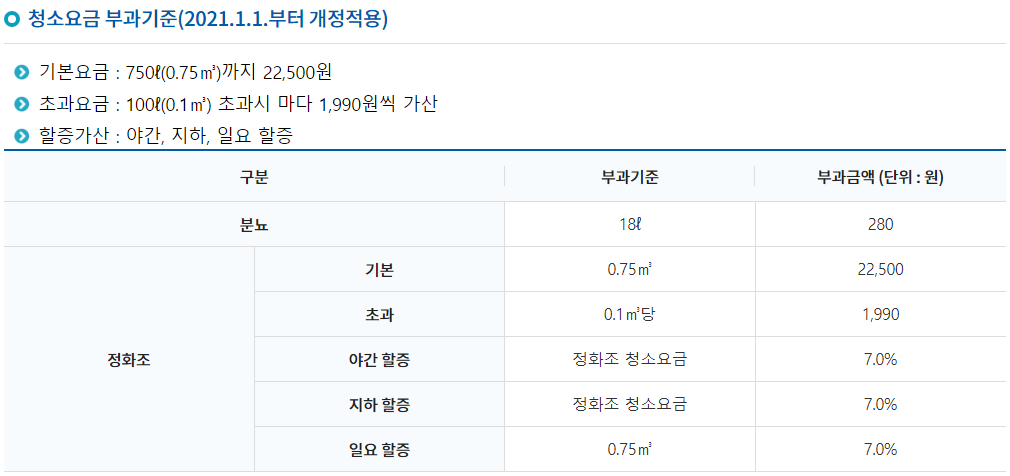 앞서 2개 표를 가지고 계산을 해보겠습니다. 그리고 원칙적으로는 최대용량 이하로 청소비용이 나오는 것이 맞겠죠? 그러니 일단 용량 최대로 계산을 해보면 정화조 청소비용이 이 금액과 같거나 그 이하가 될 것이라는 걸 알 수 있습니다.