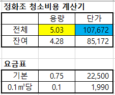 지자체별로 단가가 조금 다를 수 있으니 요금표에서 수정하시면 되고, 사용 방법은 그냥 아래표에서 노란색으로 음영이 된 곳에 전체 정화조 용량을 기입하면 파란색 음영인 곳에 가격이 산정됩니다.