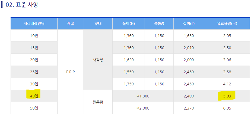 다시 저의 이야기로 돌아가보도록 하죠. 40인용 정화조가 들어가 있다는 이야기 하나만 들었는데 인터넷에 검색해보니 원통형 40인용 정화조는 규격이 정해져 있는 '표준 사양'임을 확인할 수 있었습니다.
