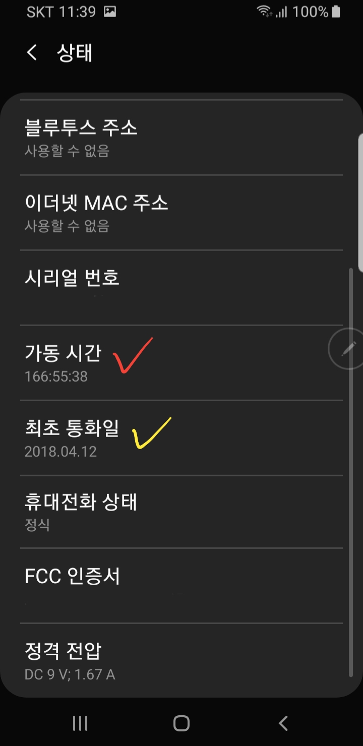 그리고 여기서 꿀팁 하나 드리면 '가동시간'을 유심히 보셔야 한다는 것 입니다. 가동시간은 스마트폰이 마지막으로 껐다가 켜진 뒤 얼마나 연속적으로 켜져 있었는지를 알려주는 시간입니다. 저와 같이 거의 1주일 가까이 된다 싶으신 분들은 스마트폰의 건강을 위해서 일주일에 한 번 정도는 폰을 껐다가 다시 켜주는 것이 좋다고 하더이다.