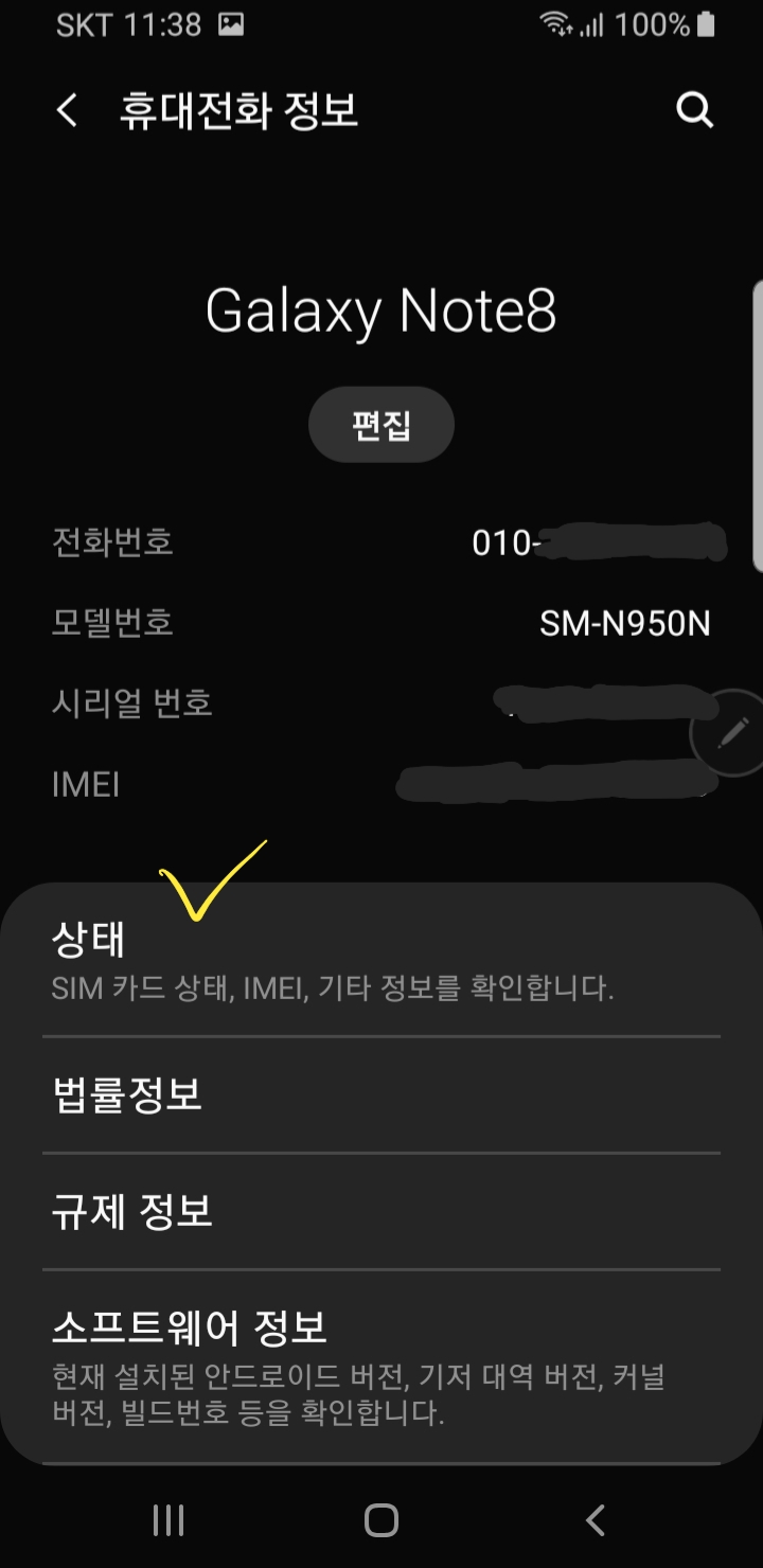 그러면 전반적으로 스마트폰에 대한 정보를 한 눈에 볼 수 있는 화면이 나옵니다. 뭐 또 암호같은 여러가지 내용들이 나오는데 다 필요없고 노란색으로 표시한 것과 같이 '상태'를 눌러줍니다.