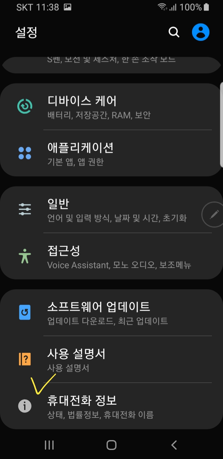 그러면 설정 화면으로 들어가게 되고 아래와 같이 여러가지 항목들이 나오는데 묻지도 따지지도 말고 화면을 최하단으로 내려줍니다. 그러면 아래에 노란색으로 체크해둔 곳처럼 '휴대전화 정보'라는 곳이 있습니다. 그 부분을 눌러줍니다.