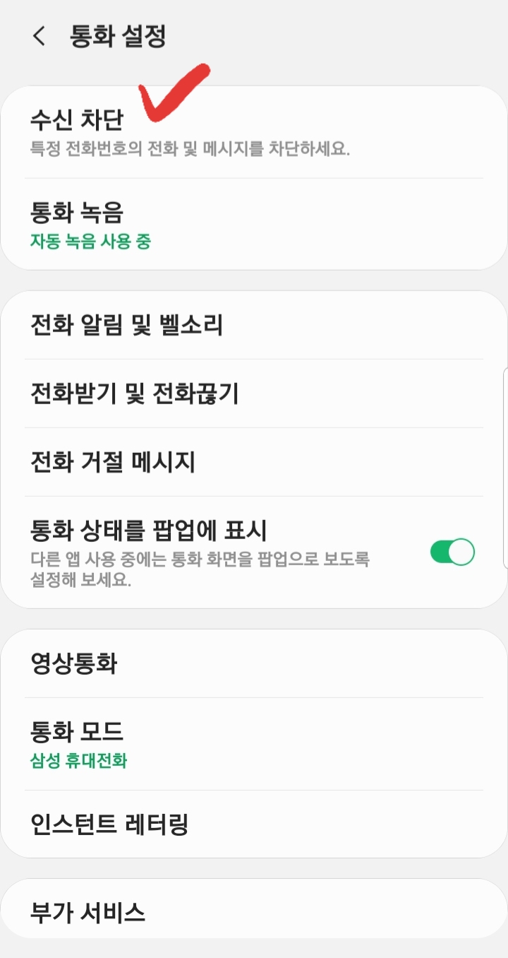 그러면 아래와 같이 다양한 통화 설정 항목들이 나오는데 여기에서 '수신 차단'을 눌러 줍니다.