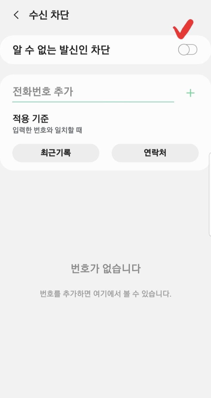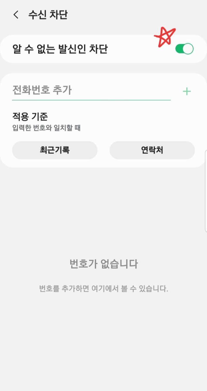 저의 사례처럼 '번호를 숨긴 발신자'만 차단하려면 아래와 같이 버튼이 활성화 되었는지 확인하면 됩니다. 버튼이 오른쪽으로 움직이면서 색상이 생겨야 합니다.