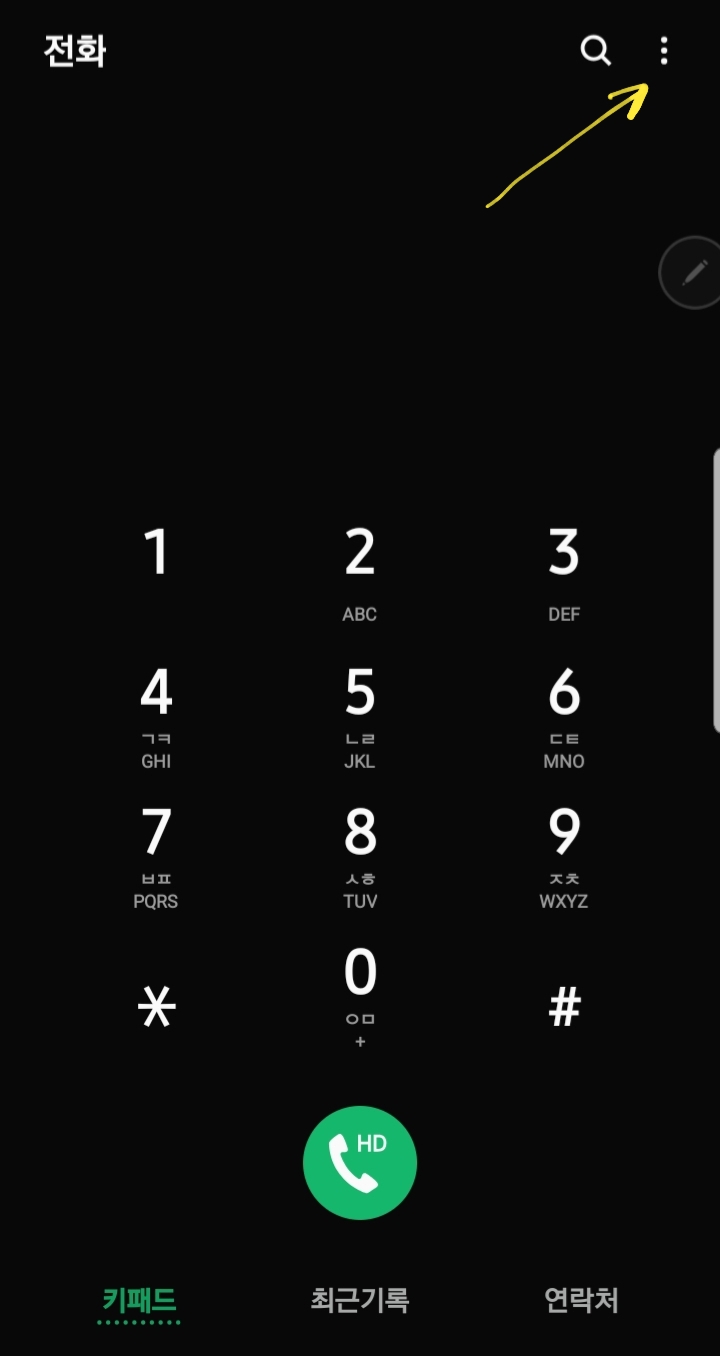우선 스마트폰에서 전화 버튼을 누르고 들어가면 아래와 같이 전화번호를 누르는 화면이 나옵니다. 그죠? 노란색 화살표로 표시한 곳의 점 3개 버튼을 눌러줍니다.