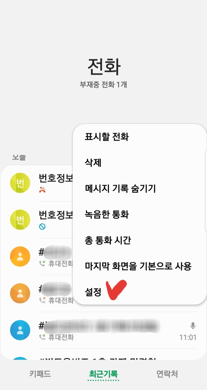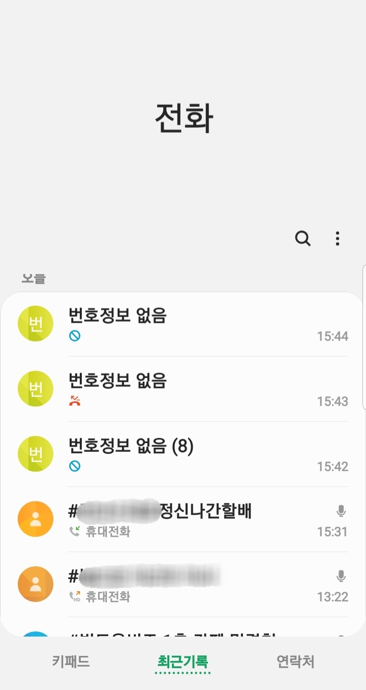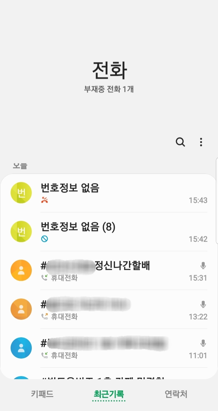 만약에 전화를 받지 않으면 아래와 같이 '부재 중'으로 남지 저와 같이 '자동 거절'이라고 표시되지는 않습니다.
