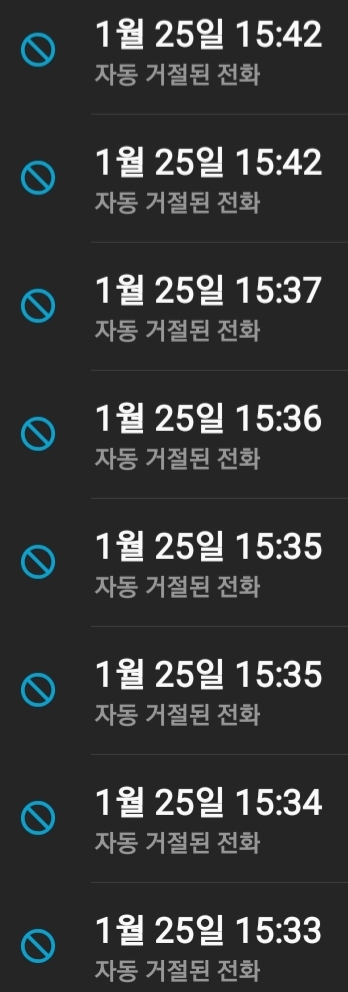 다른 업무로 집중한다고 몇 분이 흐른 뒤 '왜 전화를 안하나?' 싶었는데 폰을 보고 깜짝 놀라버렸네요. 아래와 같이 '자동 거절된 전화'가 단 시간 내에 8통이나 들어와 있었기 때문입니다. 그런데 재미있는 점은