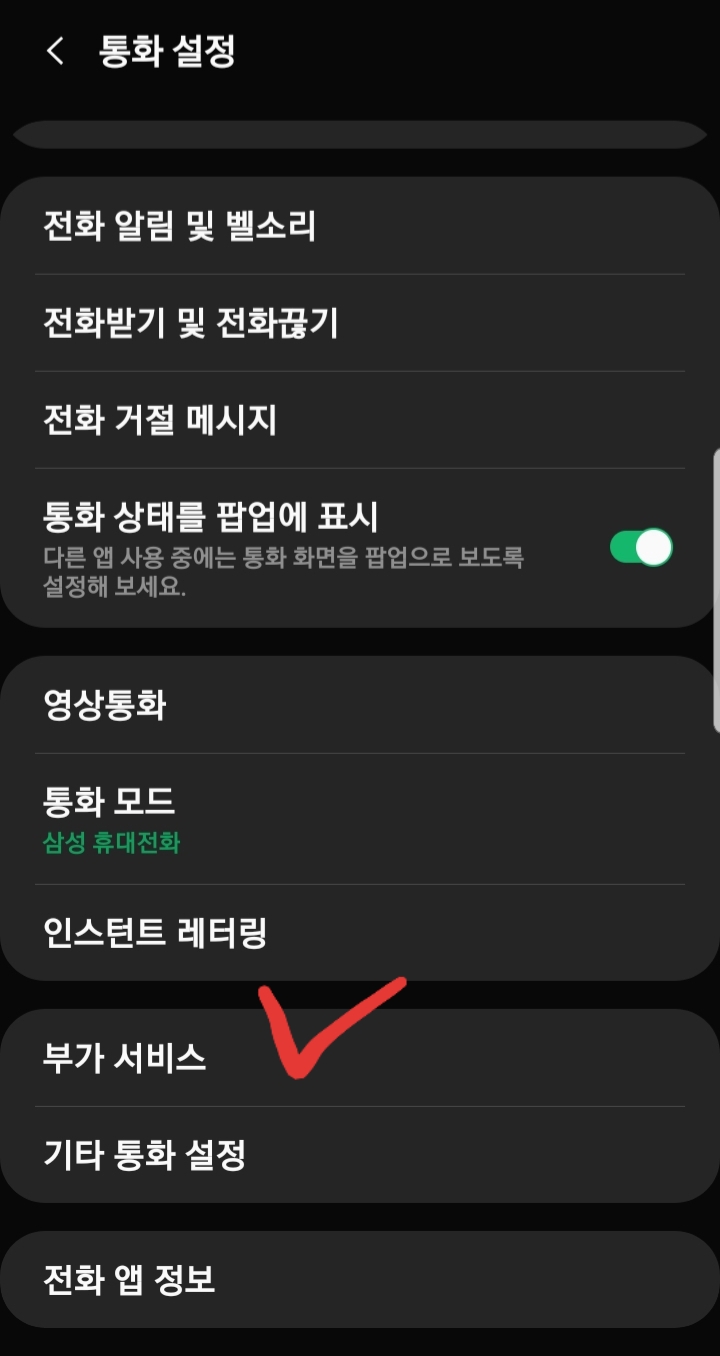 역으로 이상하게 내 전화로 다른 사람들 폰에 전화를 걸면 연결이 안된다 하시는 분들은 '내 번호를 숨김'으로 해놓은 것이 아닌지 확인해야 합니다. 방법은 통화 설정에서 '부가 서비스'를 누르고,