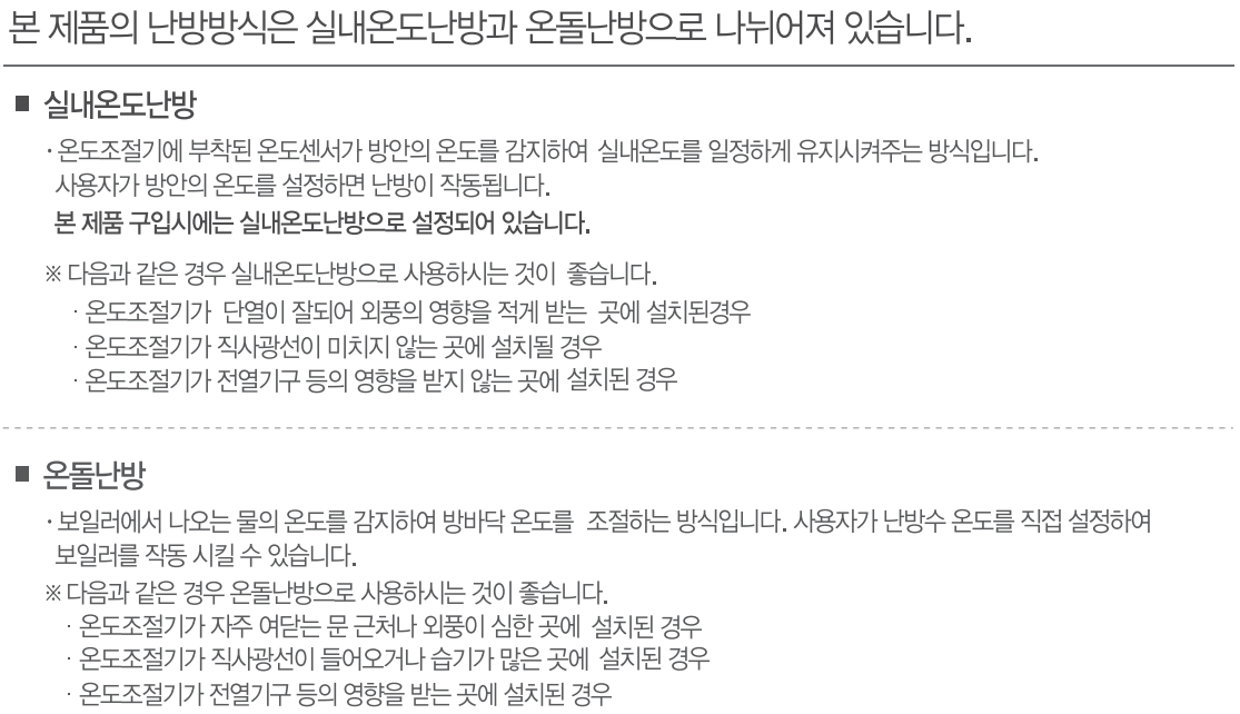 실내온도난방은 온도조절기에 부착된 온도센서가 방안의 온도를 감지하는 방식이고, 온돌난방은 보일러에서 나오는 물 온도를 감지하여 바닥의 온도를 조절하는 방식입니다.