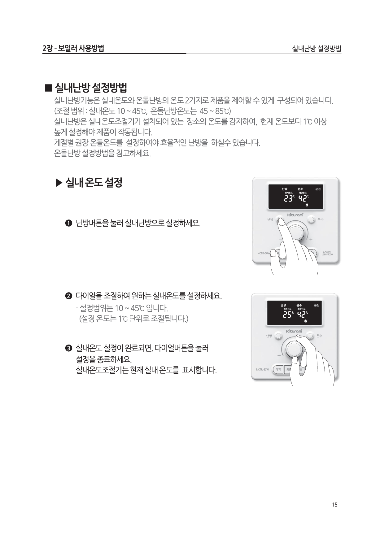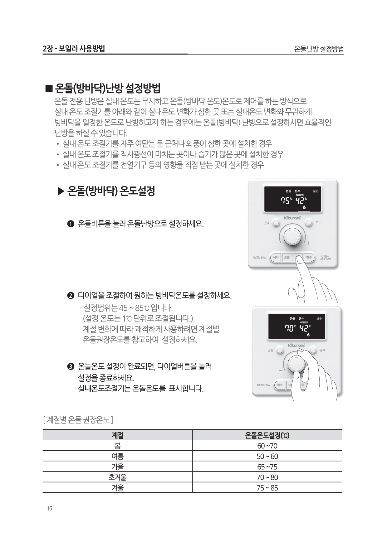 귀뚜라미 보일러의 취급설명서도 읽어봤는데 내용이 거의 비슷합니다. 일단 실내난방 설정에 대한 내용은 동일하고 온돌 난방에 대한 조금 더 구체적인 내용이 들어 있네요. 참고로 귀뚜라미 보일러를 실내난방으로 사용하실 때는 현대온도보다 1도 이상 높게 설정해야 보일러가 가동된다고 하니 참고하시면 되겠습니다.