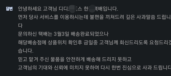 또한 판매사에 아무리 배송 클레임을 걸어봤자, 소비자가 직접 배송사에 클레임 거는 것 그 이상도 그 이하도 아닙니다. 판매사 콜센터를 통해 배송 클레임이 들어오면 결국 콜센터에서 다시 배송사로 연락해 문제 상황을 알리고 확인 요청을 하는 것, 그 뿐입니다. 차리리 고객이 배송사에 직접 연락해서 문제가 해결될 때까지 독촉하는 것이 더 빠른 방법일 수 있습니다.