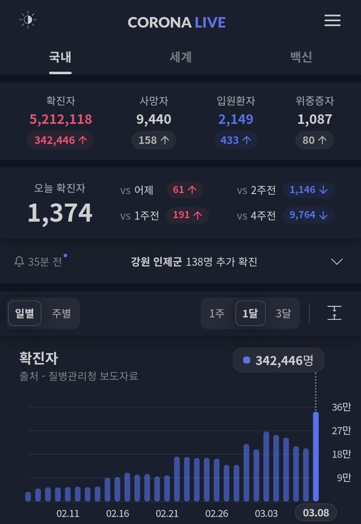 하필 제가 확진된 날은 제가 아는 한 확진자가 신기록을 세운 날이네요. 무려 34만명이 넘네요. 코로나 입대 동기 여러분! 우리가 할 수 있는 일은 이제 최대한 후속 조치를 잘하고, 건강을 회복해서 다시 사회로 나오는 것 입니다. 한 분도 중증으로 가시거나 죽지마시고, 수퍼 면역자로 건강하게 제대해서 사회로 돌아갑시다!
