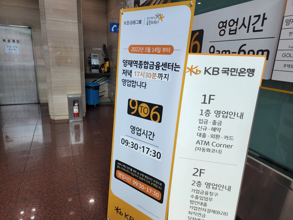 국민은행 양재역종합금융센터는 코로나 단축 때문에 오전 9시 30분부터 오후 5시 30분까지 입니다.